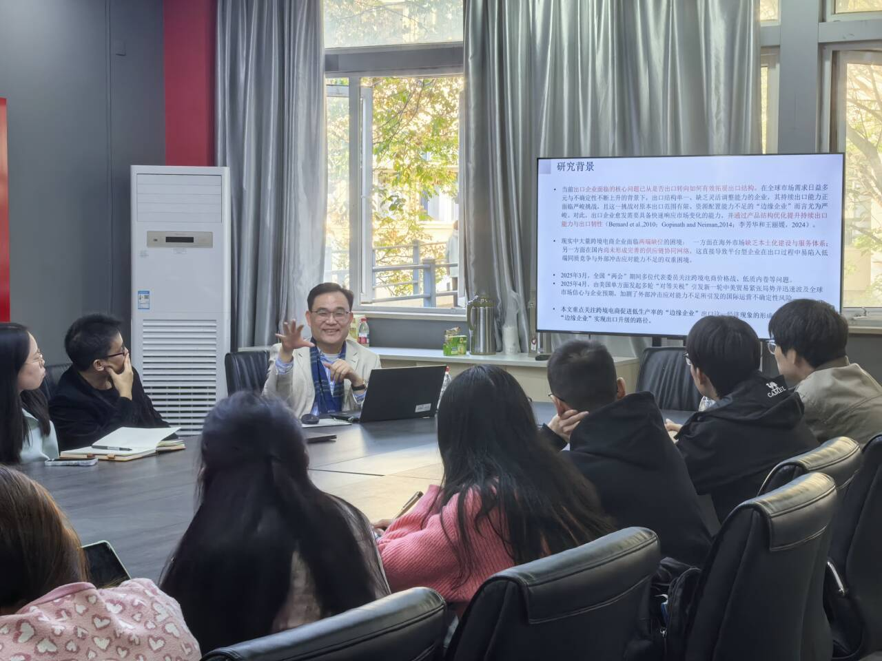 2025年11月5日下午3:00,东南大学国际经济研究所所长邱斌教授莅临我院学术前沿论坛,为师生带来“不出海就出局?——跨境电商如何赋能‘边缘企业’实现出口突围”的专题学术讲座。讲座由国际经贸学院谭用教授主持,我院部分青年教师和硕博研究生参与。