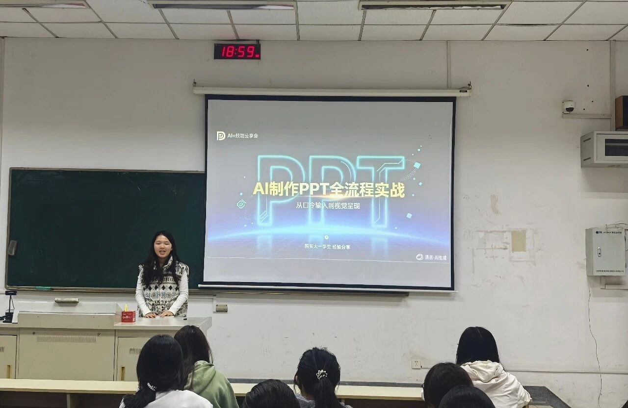 分享环节中,朱灿灿同学聚焦豆包、Nano Banana两款PPT创作AI工具展开讲解,着重强调优质PPT需兼顾严谨内容逻辑与精致视觉呈现。同时,她向同学们演示了她依托豆包生成PPT的完整流程:先搭建完善文字底稿,优化调整后再生成演示文稿,让在场同学收获直观感悟。