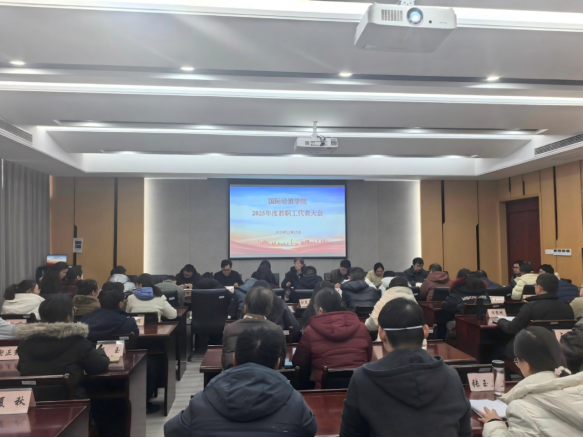 为深入学习贯彻习近平新时代中国特色社会主义思想,进一步推进学院民主政治建设,切实保障教职工依法行使民主决策、民主管理、民主监督的权利,12月25日下午,国际经贸学院于德经楼308会议室召开2025年度教职工大会。学院领导班子及全体教职工参会,会议由院党委书记周亚芳主持。
