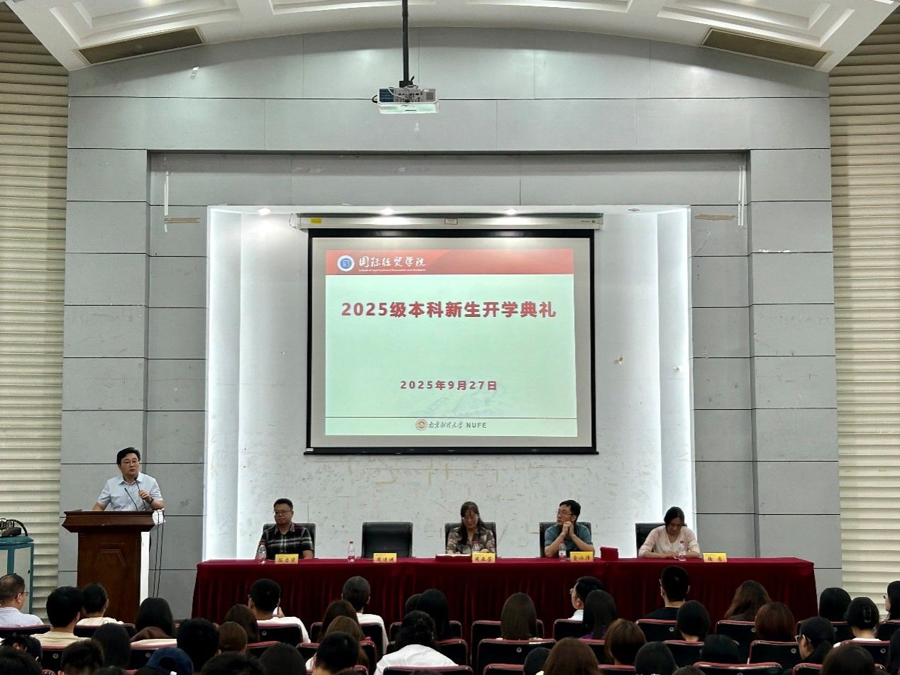 9月27日下午,国际经贸学院2025级新生开学典礼在德经楼二楼报告厅隆重举行。学院党委书记周亚芳,院长余泳泽,副院长徐圆、陈启斐,部分教师代表、学工老师和全体2025级新生共同参加。开学典礼由院党委副书记周进进主持。
