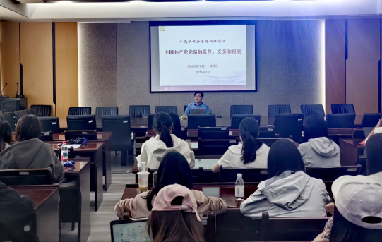 为深化入党发展对象和党员理想信念教育,引导青年学生以党员标准严格要求自身,2026年4月26日下午,国际经贸学院于德经楼308会议室开展专题党课培训。本次党课由本科生第二党支部政治辅导员、国际经贸学院党委副书记周进进主讲,围绕“中国共产党党员的条件、义务和权利”主题,阐释党员身份的内涵要求与实践准则。
